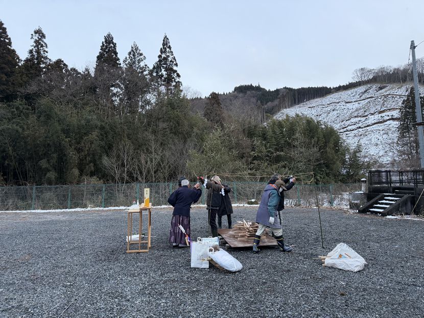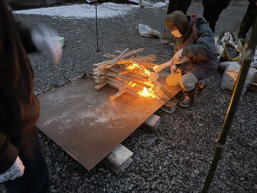 最初な神主さんの指導で、焚き上げの神事の舞台や、陣の作成などすべて下文字自治会の方たちの設置です。